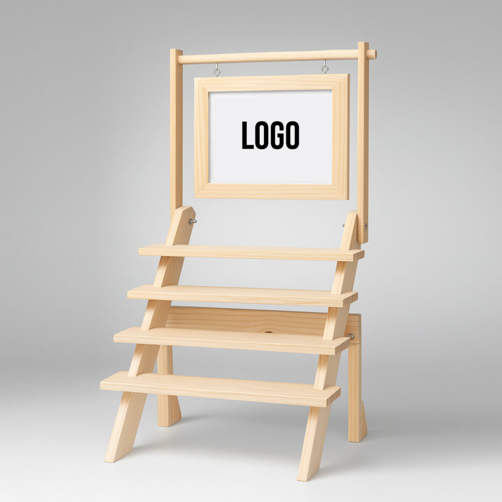 Custom Pinewood Staircase Display Stand – 3-Tier Organizer with Branding Frame & 3 Bars